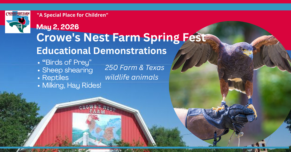 Crowe’s Nest Farm is a working farm and animal rescue sanctuary and is open to the public. We host over 40,000 Central Texas school children a year. Located in Manor, Texas, just 8 miles east of Austin, you can see over 250 domestic farm animals and native non-releasable Texas wildlife. learn more>>